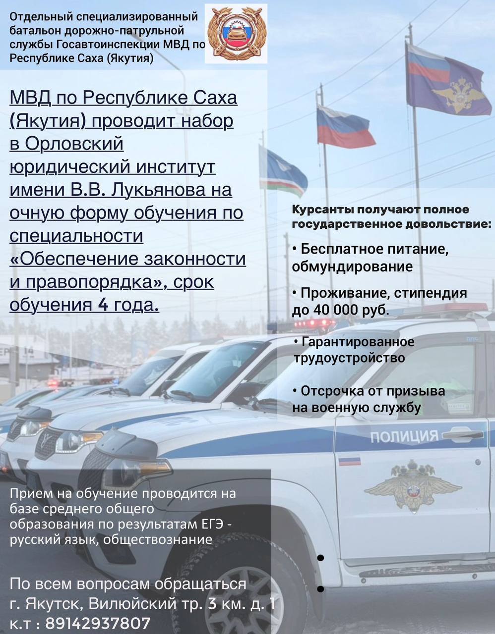 ОСБ ДПС Госавтоинспекции МВД по Республике Саха (Якутия) проводит набор в Орловский юридический институт имени В.В. Лукьянова на очную форму обучения по специальности