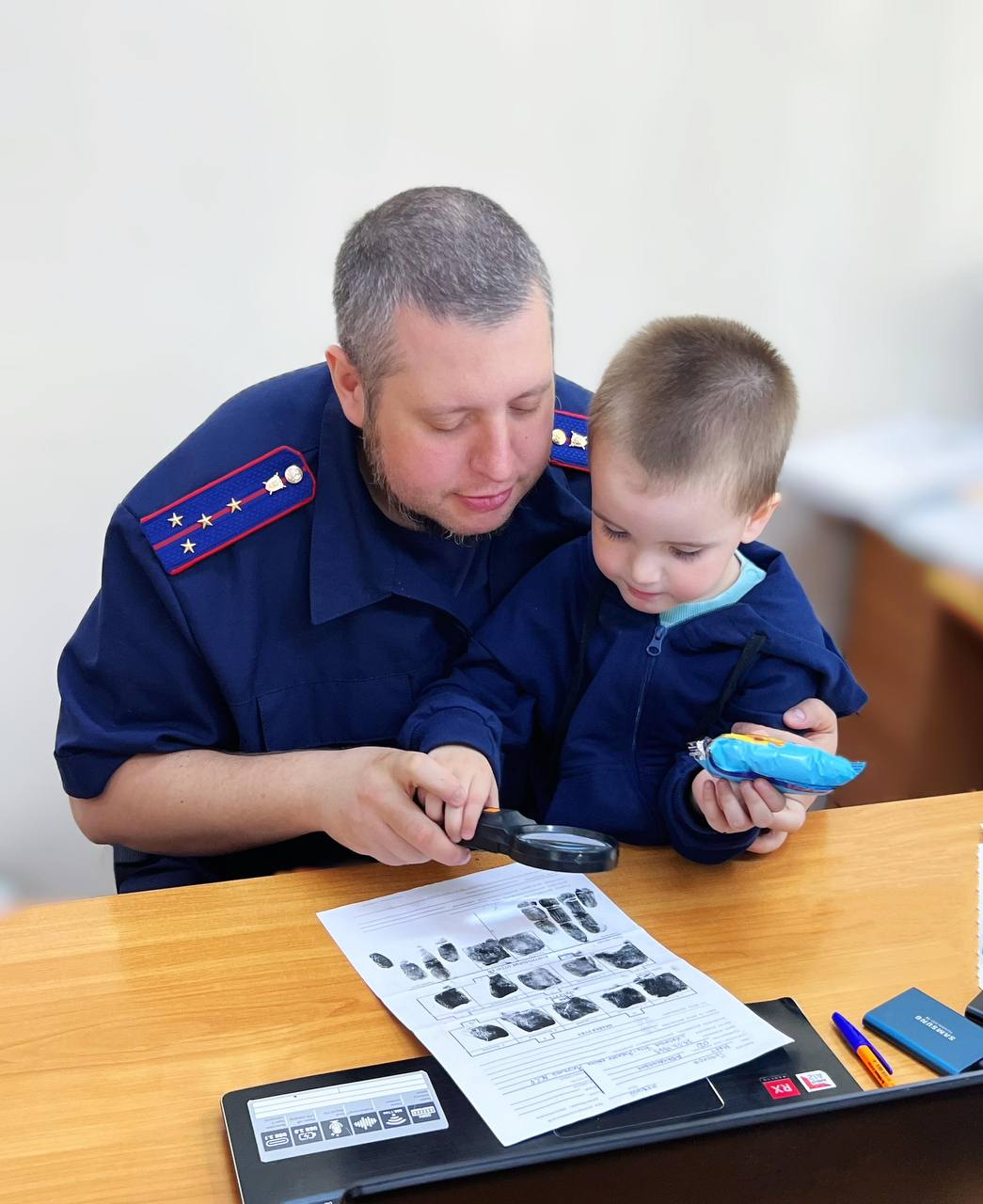 Илья никогда не отказывается делиться секретами своей работы с юными якутянами, приезжает на уроки к школьникам и показывает им заветный чемодан криминалиста. Трудно передать восторг ребят, когда они видят собственные отпечатки пальцев на белой бумаге или в синем свете лампы. Интерес к работе отца проявляет и маленький сын, которому талантливый криминалист показывает захватывающие детали своей работы.