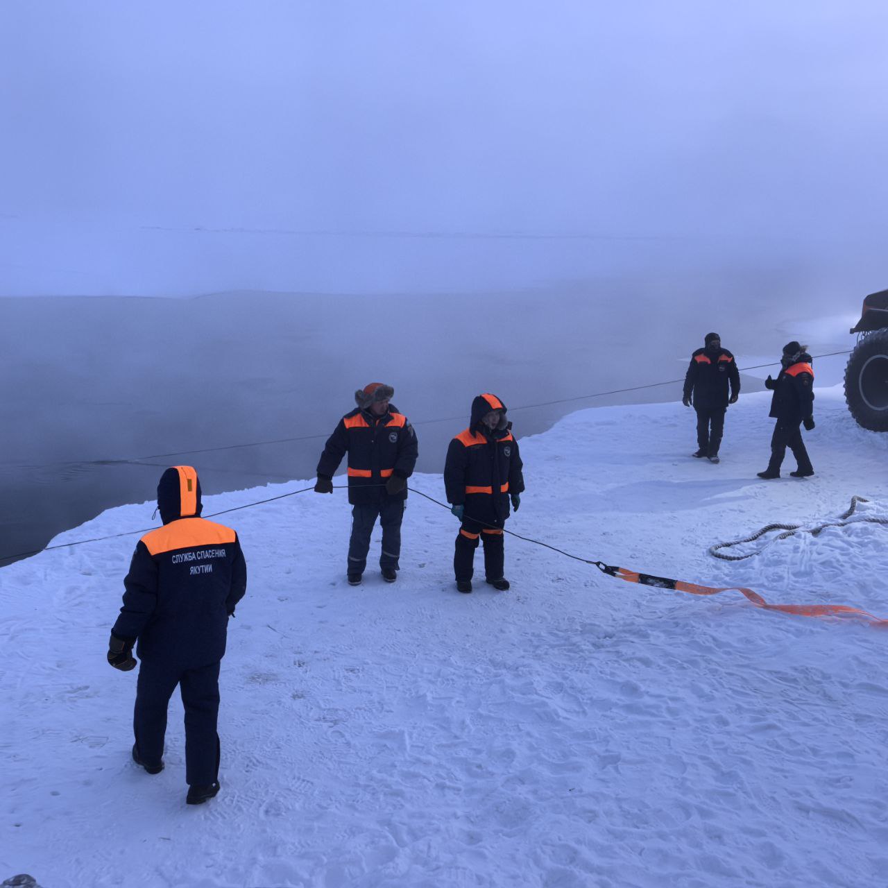 Прибывшие на место происшествия водолазы Службы спасения Якутии приступили к спускам, чтобы зацепить крюк на машине. Долгое время не удавалось это сделать, так как мешало сильное течение. Один за другим спускались все четверо водолазов.