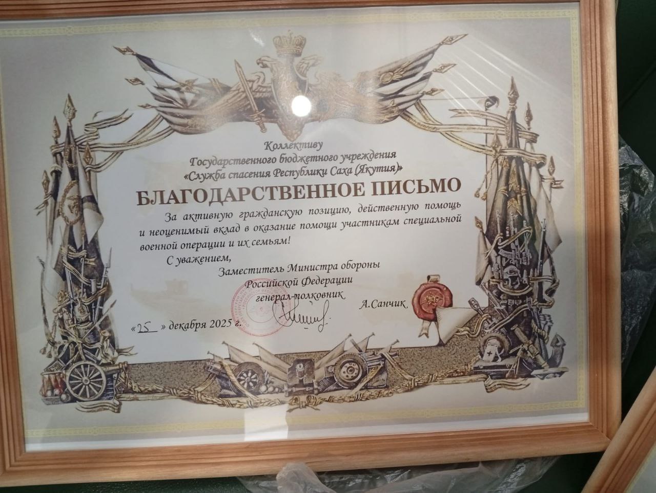 Сегодня, 30 декабря, Глава Республики Саха (Якутия) Айсен Николаев вручил коллективу Службы спасения Якутии Благодарственное письмо от заместителя Министра обороны РФ генерал-полковника Александра Санчик за активную гражданскую позицию, действенную помощь и неоценимый вклад в оказании помощи участникам специальной военной операции и их семьям.