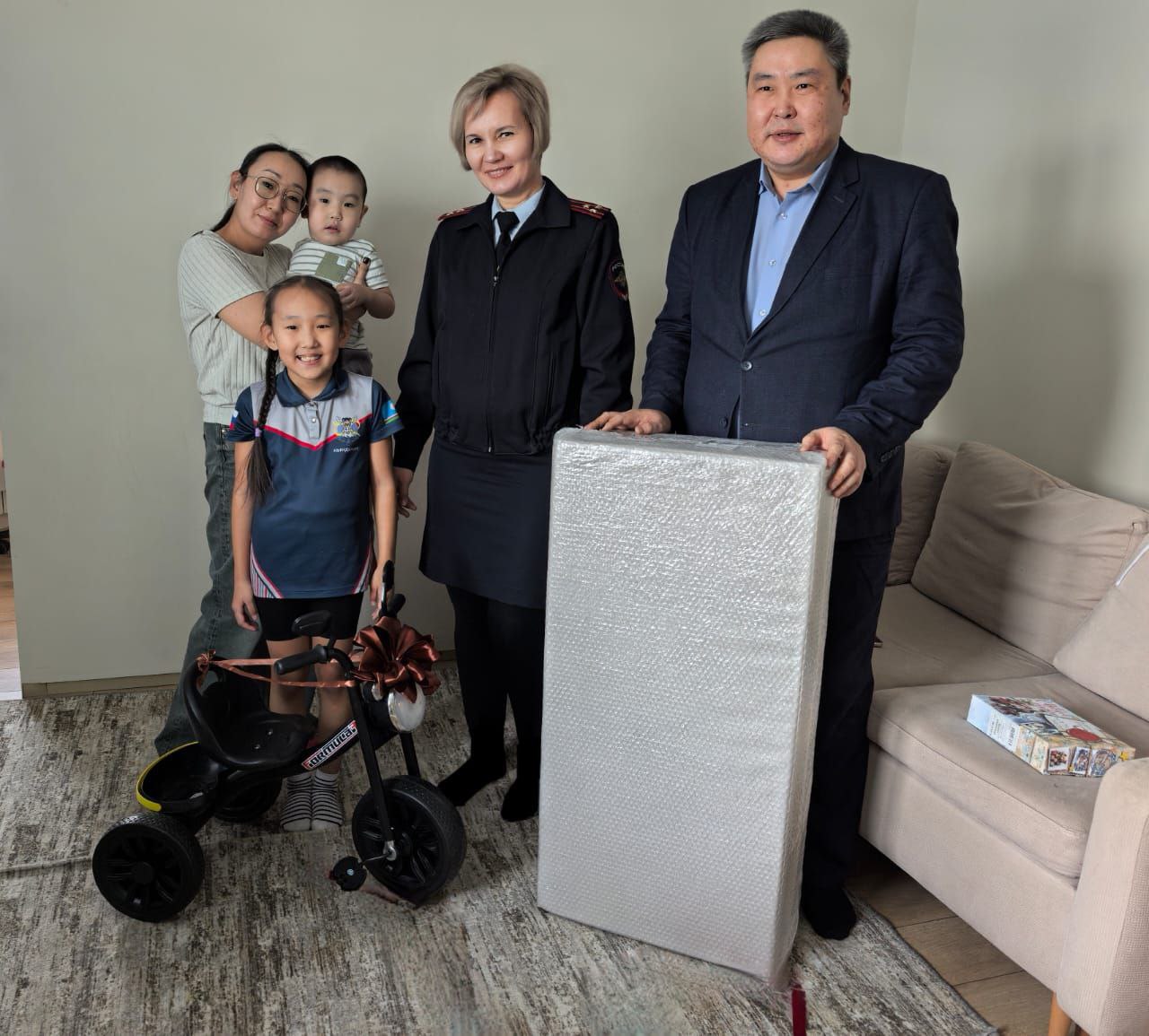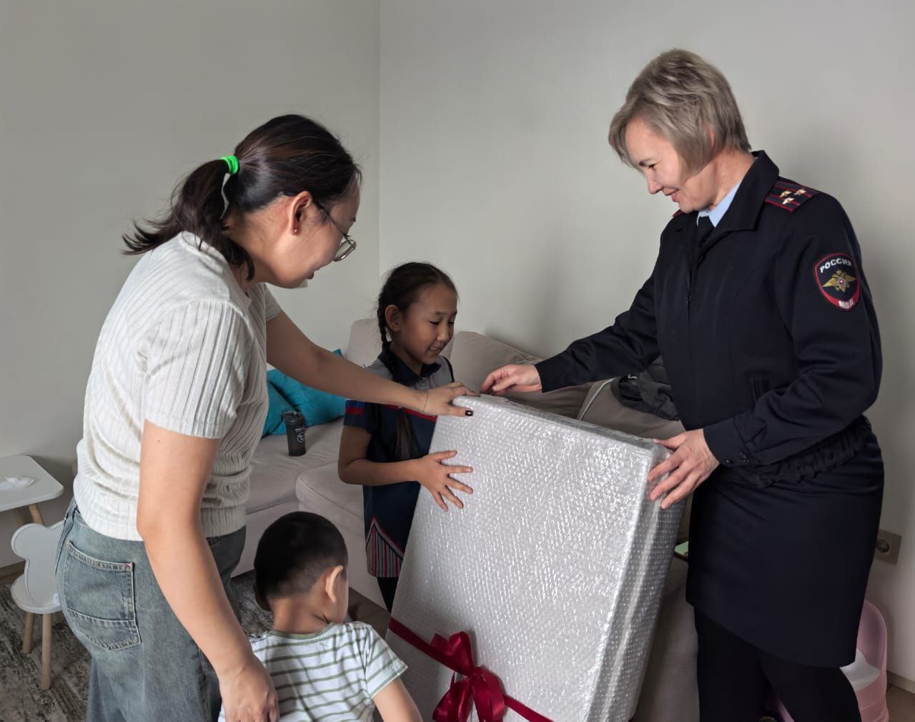 Полицейские пришли в гости к детям и вручили им подарки. Маленький Айсен очень обрадовался новенькому велосипеду. А его старшей сестре подарили спортивный мат, о котором она мечтала. Алесия занимается в этно-акробатической академии «Кындыкан» и участвует в многочисленных соревнованиях по чир спорту и спортивной скакалке, где занимает призовые места. Новый инвентарь непременно поможет ей в достижении дальнейших спортивных успехов.