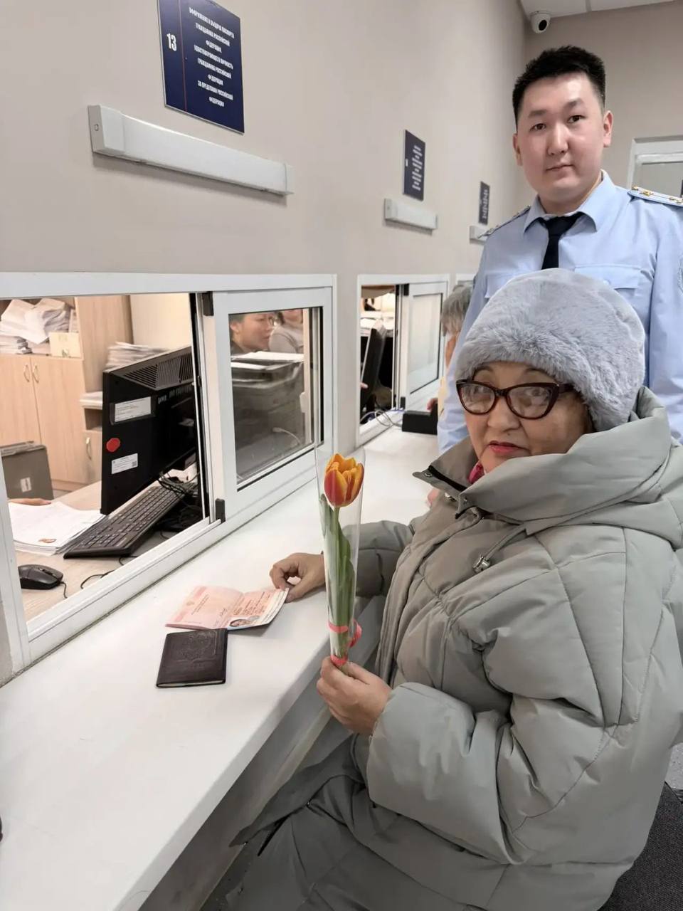 Полицейские поздравили женщин, которые получали заграничные паспорта, и вручили им нежные тюльпаны, пожелав крепкого здоровья, любви, тепла и благополучия.