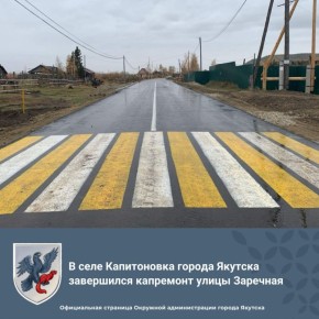В рамках национального проекта «Инфраструктура для жизни», реализуемого по инициативе Президента России Владимира Путина, завершен ремонт улицы Заречной в селе Капитоновка, расположенного близ столицы Якутии - города Якутска.Работы включали комплекс...