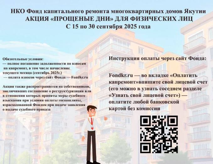 Успевайте погасить задолженность по взносам на капремонт без пени!Напоминаем, что Фонд капремонта Якутии с 15 по 30 сентября 2025 года проводит акцию по оплате взносов без пени «Прощеные дни» для физических лиц.Условия акции: полное погашение всей...