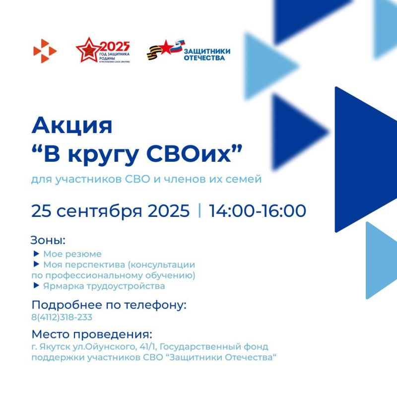 Дата проведения:25 сентября с 14.00 ч. -16.00 ч.Место:г. Якутск ул. Ойунского 41/1, Госфонд «Защитника Отечества»Территориальный центр занятости населения г. Якутска приглашает на Акцию «В кругу СВОих» для участников СВО и членов их...