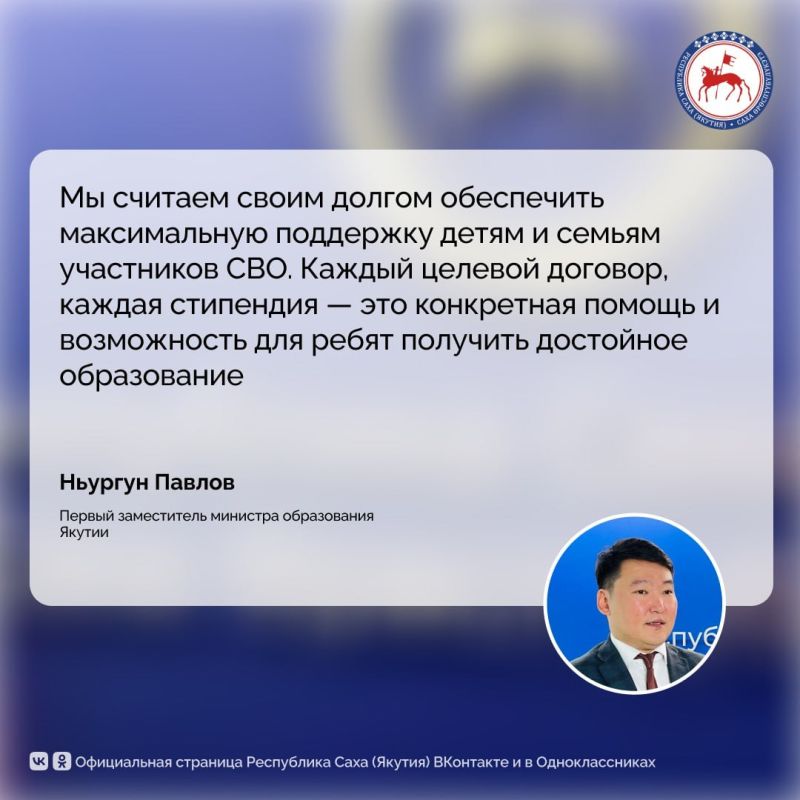 На сегодняшний день по целевому договору обучается 31 человек из семей участников СВО. Об этом на брифинге сообщил первый заместитель министра образования Якутии Ньургун Павлов.Кроме того, специальные стипендии получают 811...