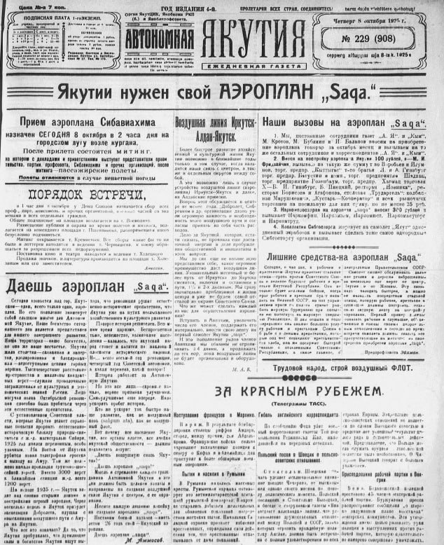 — такая заметка красуется на первой полосе газеты «Автономная Якутия» от 7 октября 1925 года.