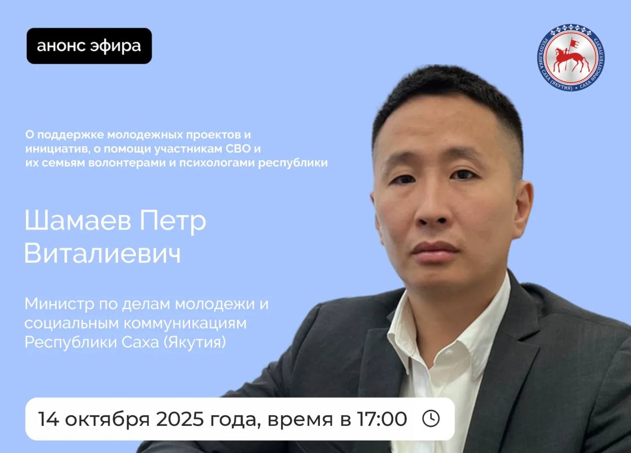 Министр по делам молодежи и социальным коммуникациям Республики Саха (Якутия) Шамаев Петр Виталиевич во вторник, 14 октября 2025 года, проведет прямой эфир на официальных страницах Администрации Главы и Правительства республики в социальных сетях «ВКонтакте» и «Одноклассники».