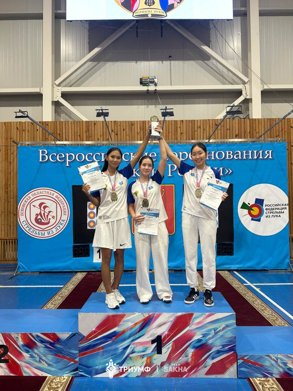 Алиса Кириллина, Мария Тараярова и Кристина Дрозд вместе выступили в командных соревнованиях по классическому луку и уверенно заняли первое место среди юниоров до 22 лет.