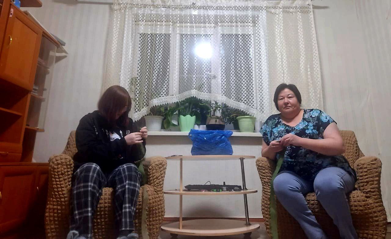 Лия Тинкеева, член УИК 446, с дочерью Мирославой крутят "патрончики" для плетения маскировочных сетей. Лия Германовна работает художественным руководителем Центра Досуга "Возрождение" с. Чапаево Олекминского района.