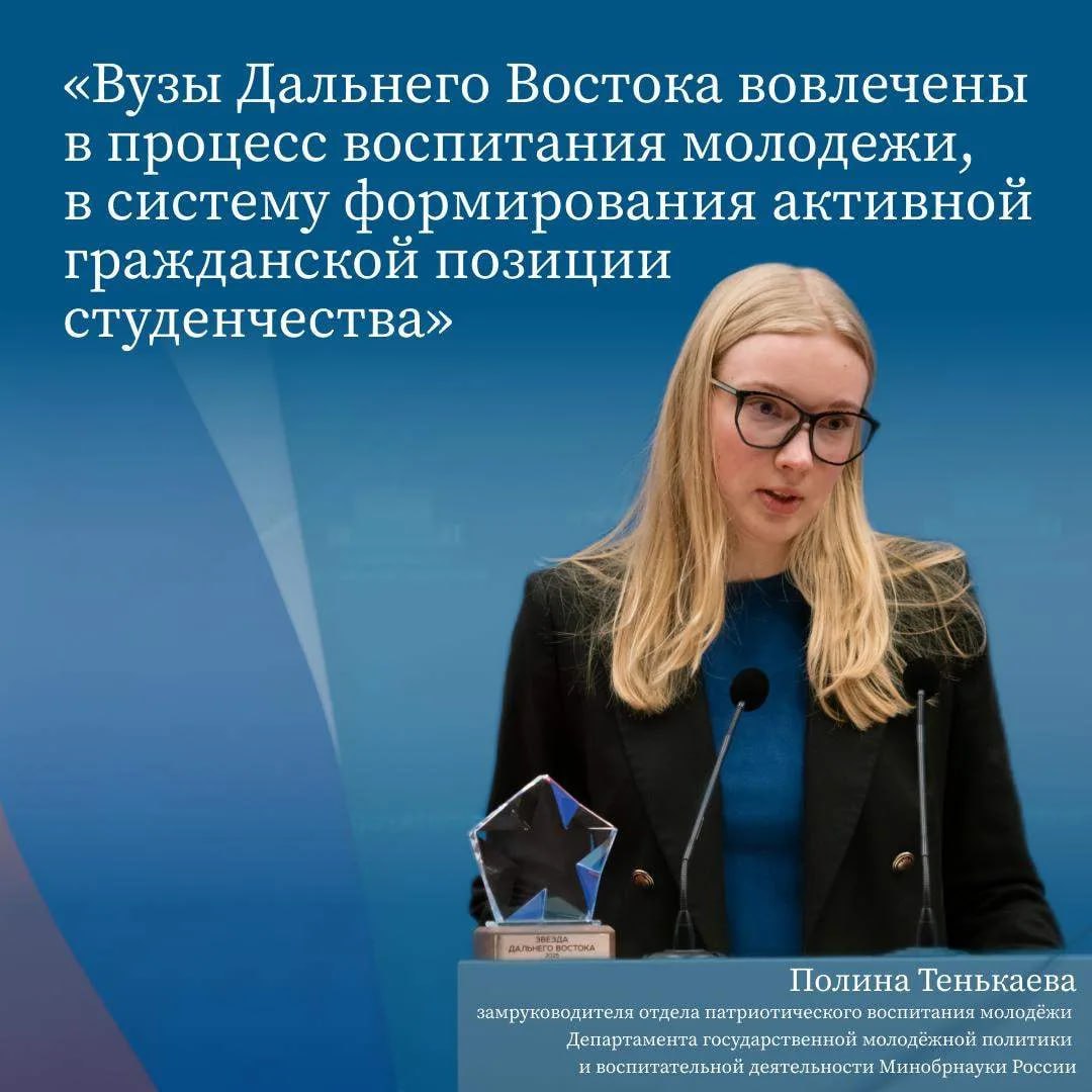 «В рамках премии «Звезда Дальнего Востока» активно представлено сообщество вузов не только в специальной номинации, но и по другим направлениям. Это показывает, что вузы включены в государственную повестку, в том числе оказывают содействие в проведении специальной военной операции», – отметила представитель Департамента государственной молодёжной политики и воспитательной деятельности Минобрнауки России Полина Тенькаева.
