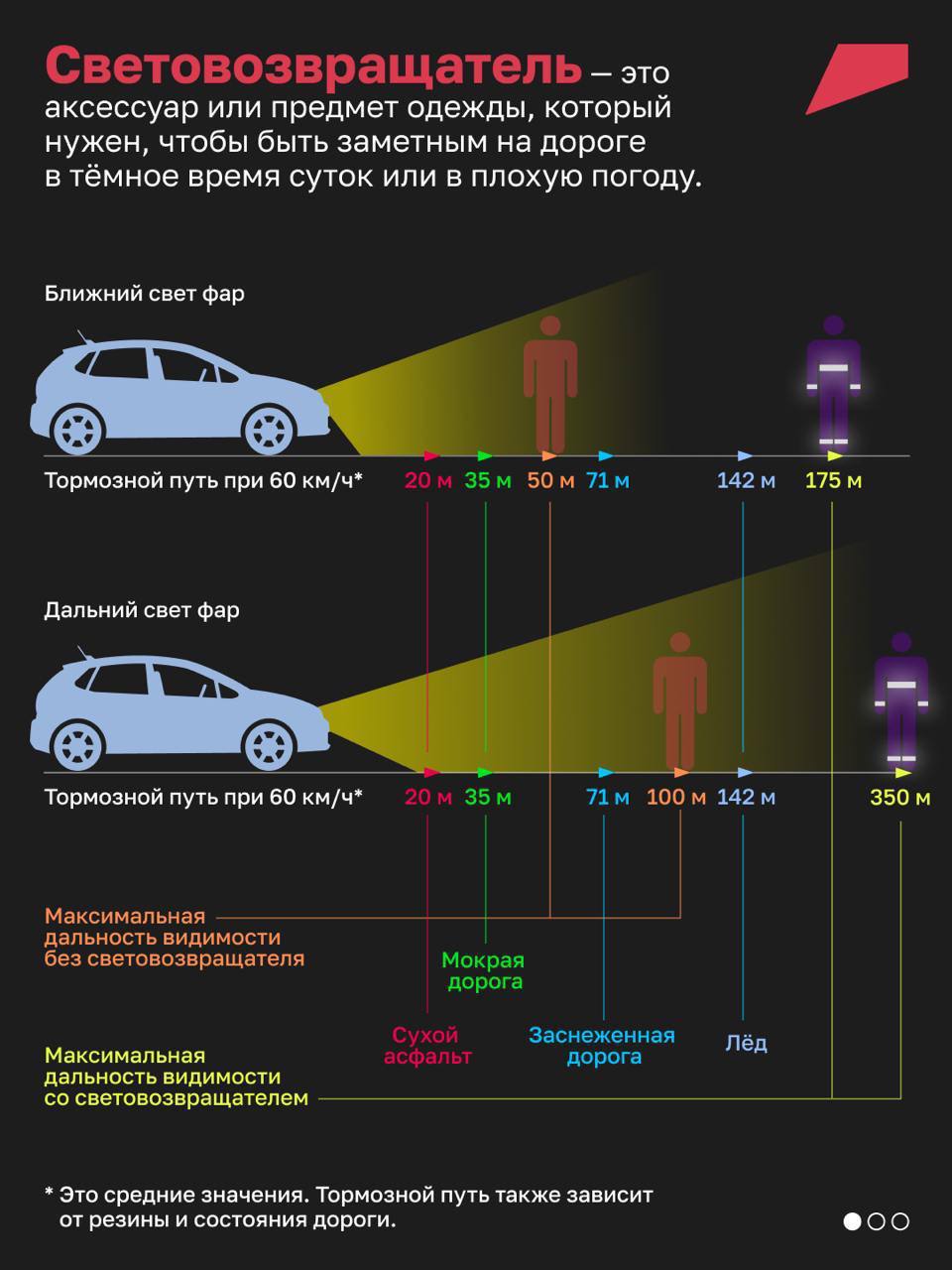 Без световозвращателя водитель замечает пешехода лишь с 25-50м при ближнем свете фар. Со световозвращателем дистанция увеличиваетсядо 150-200м, а при дальнем свете - до 350м. Это даёт водителю дополнительные 15-25секунд на реакцию, снижая риск ДТП в несколько раз.
