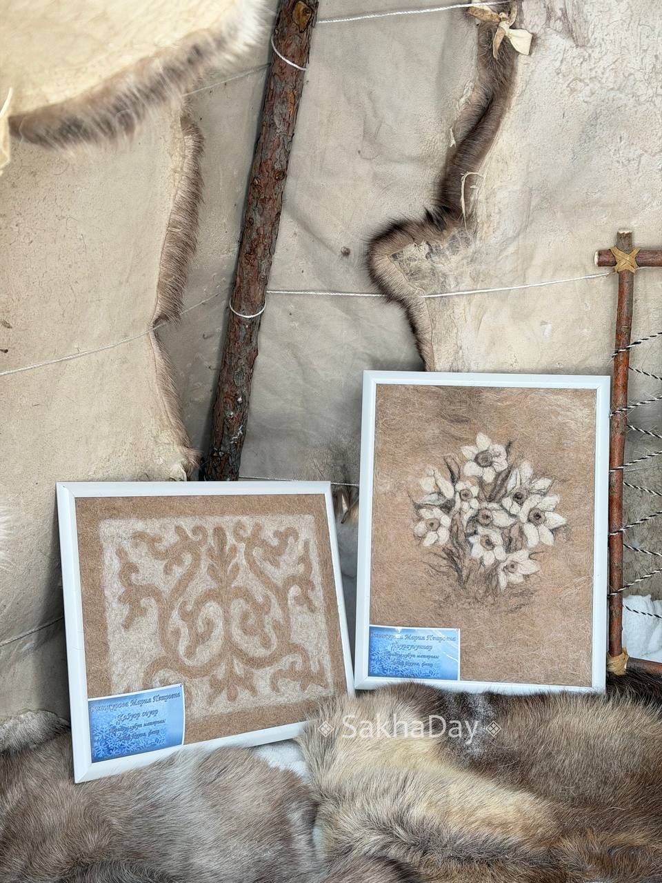 Свои работы представила мастер Мария Винокурова из села чгэй. Она создает картины из оленьей шерсти в технике валяния. Материал мастерица собирает весной, в период линьки оленей.