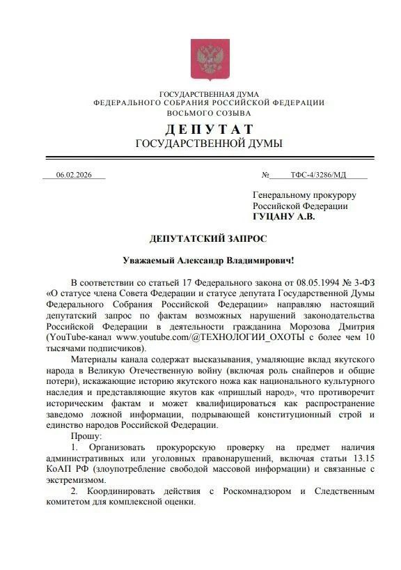 Депутат Госдумы потребовал проверить блогера на предмет экстремизма и искажения истории после видео о якутских ножах и ВОВ