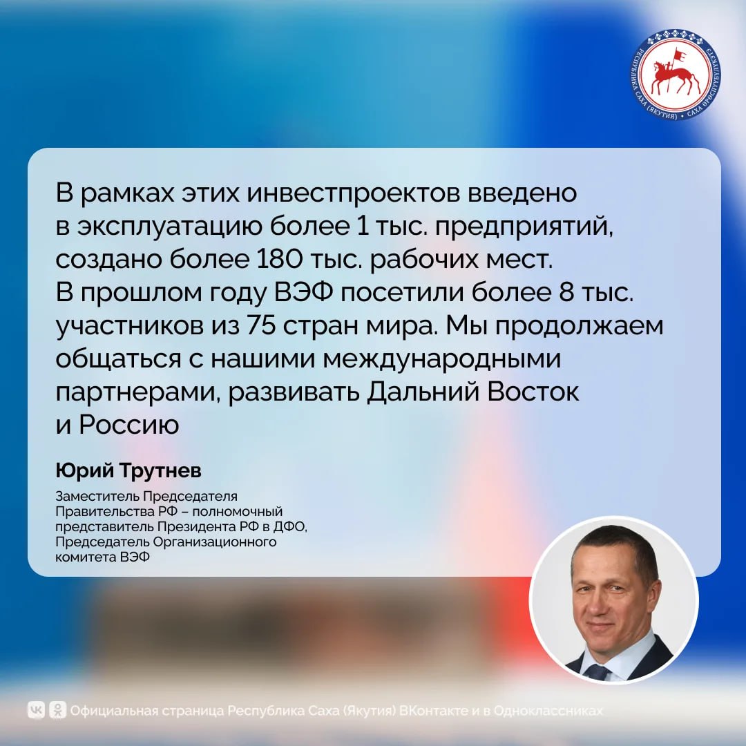 Об этом на заседании Организационного комитета по подготовке и проведению XI Восточного экономического форума (ВЭФ) заявил Заместитель Председателя Правительства РФ – полномочный представитель Президента РФ в ДФО, Председатель Организационного комитета ВЭФ Юрий Трутнев.