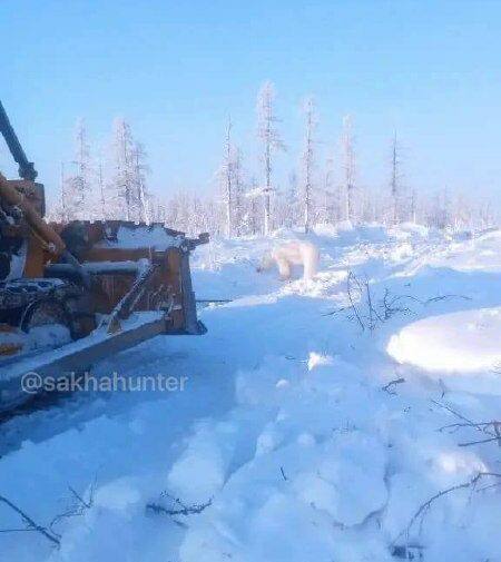 В Жиганском районе Якутии путь бульдозеру перегородил белый медведь, сообщает телеграм-канал «Охота и рыбалка в Якутии».