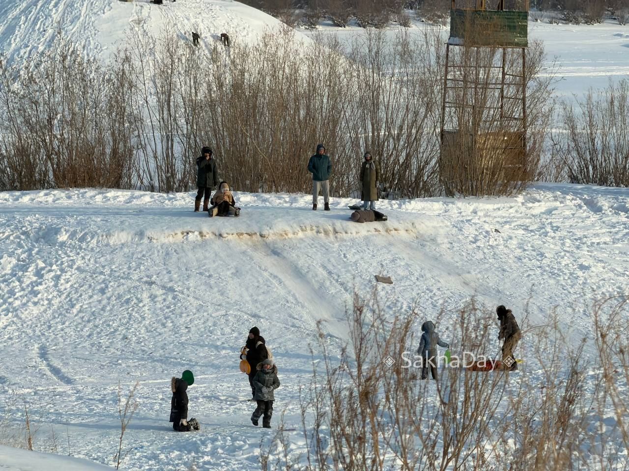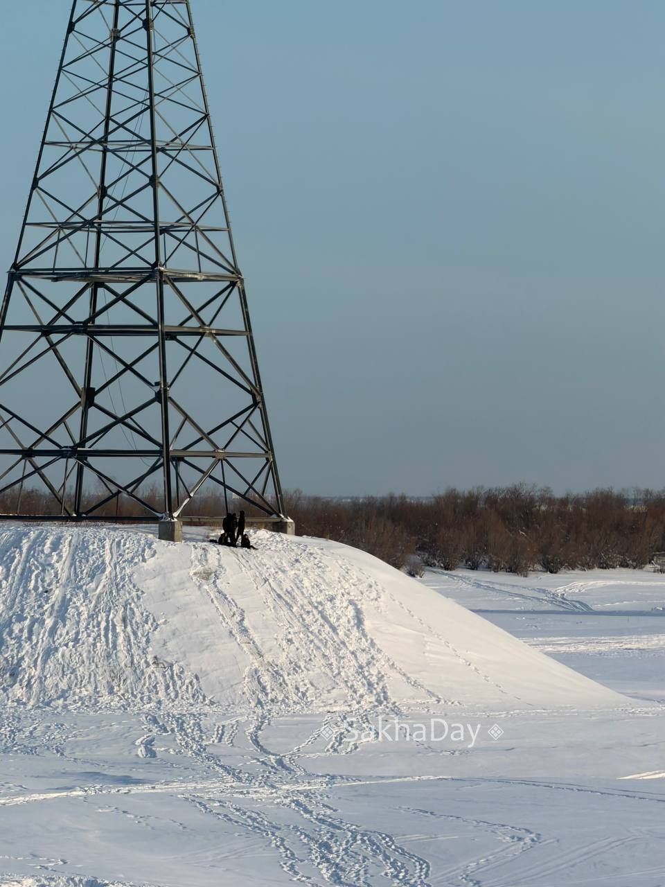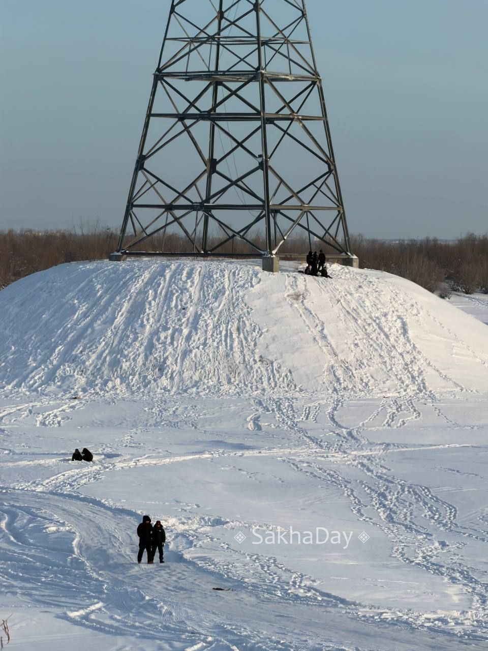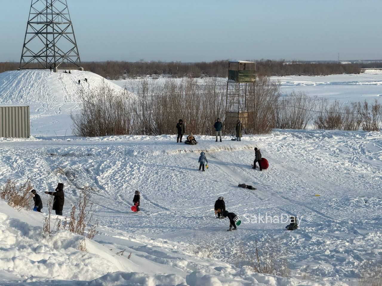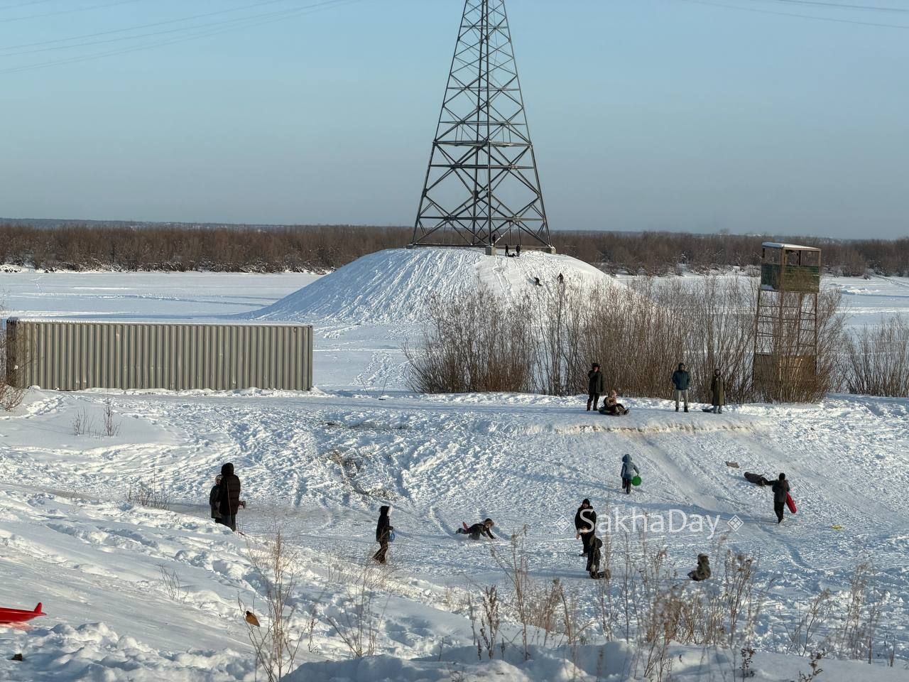 Зимние забавы. дети катаются с горки рядом с опорами ЛЭП #дляsakhaday