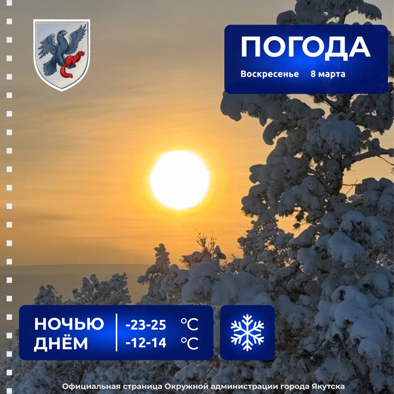 Сегодня в Якутске, по данным Якутского УГМС, утром и днём небольшой снег, ветер северо-западный 4-9 м/с. Температура воздуха -12 -14°С.Подпишись на Вести Саха в MAX | Предложить новость | Подписаться