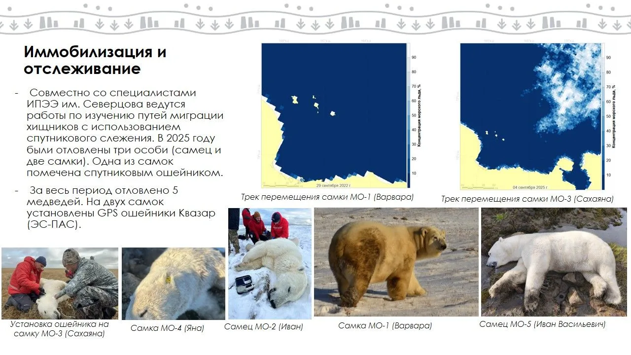 В 2025 году за один полетный день визуально зарегистрировано 113 особей белого медведя: 101 — на островах, и 12 — на материковой части вдоль береговой линии заповедника.
