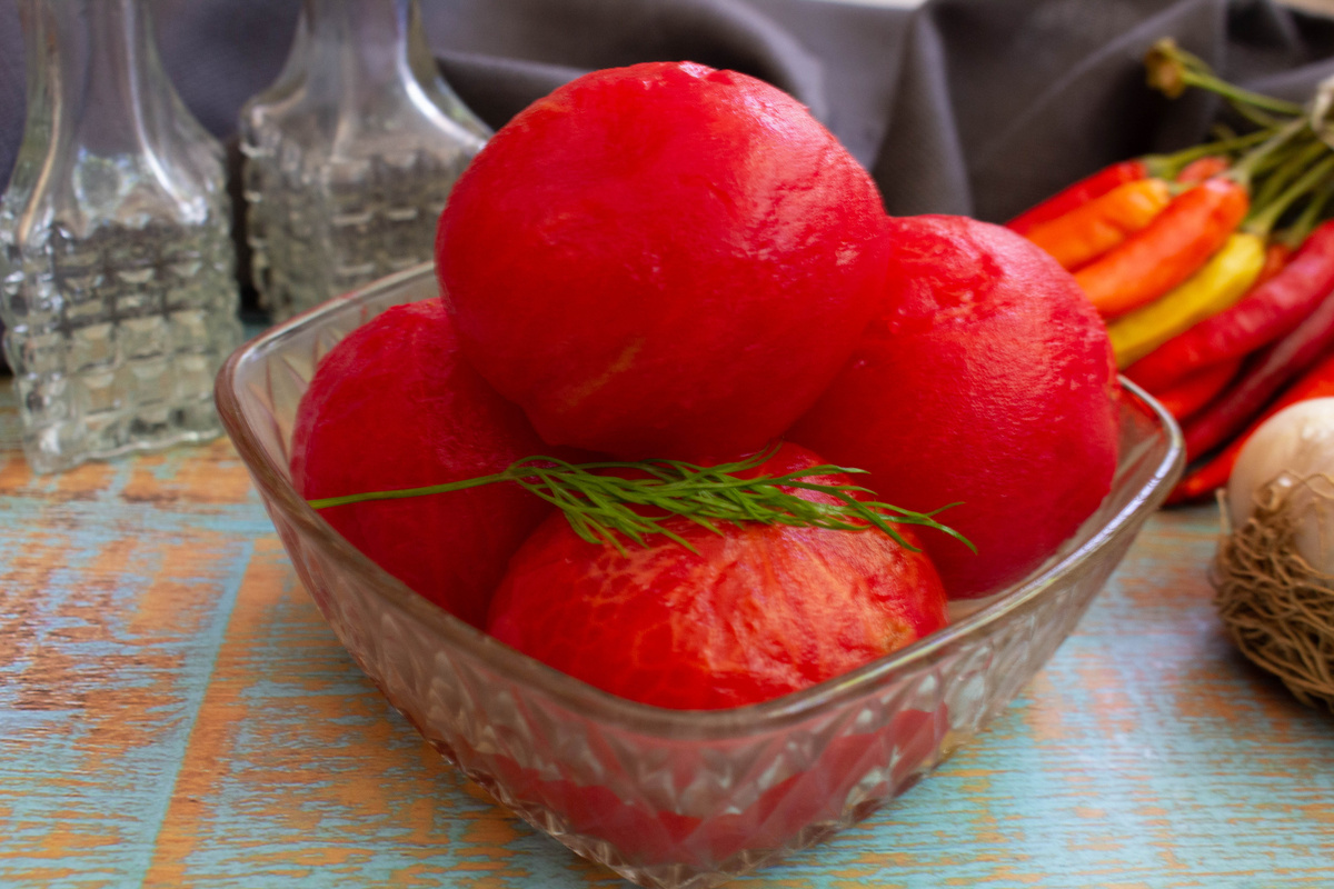 Нужно начать с подготовки помидоров. На каждом плоде следует сделать не слишком глубокий крестообразный надрез на месте плодоножки. Помидоры заливаются кипятком и оставляются на 10 минут. После этого кожица легко удаляется, что значительно улучшит вкус готового блюда.