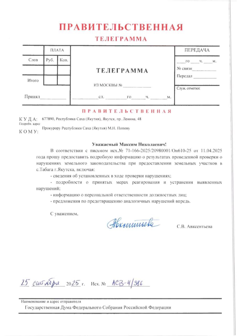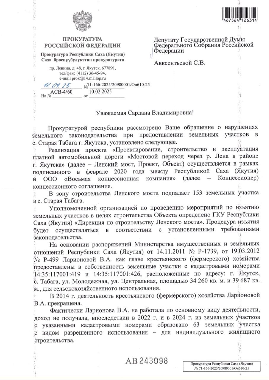 Прокуратура прямо указывает на главного «смотрителя», который бездействовал: Управление Росреестра по Якутии не приняло мер, чтобы пресечь это нарушение. В результате сложилась идеальная схема: одни чиновники переводят землю, создавая искусственную ценность, а другие делают вид, что ничего не замечают. Итог, по данным депутатов, — государство готово потратить 850 миллионов бюджетных рублей на выкуп этих самых участков.