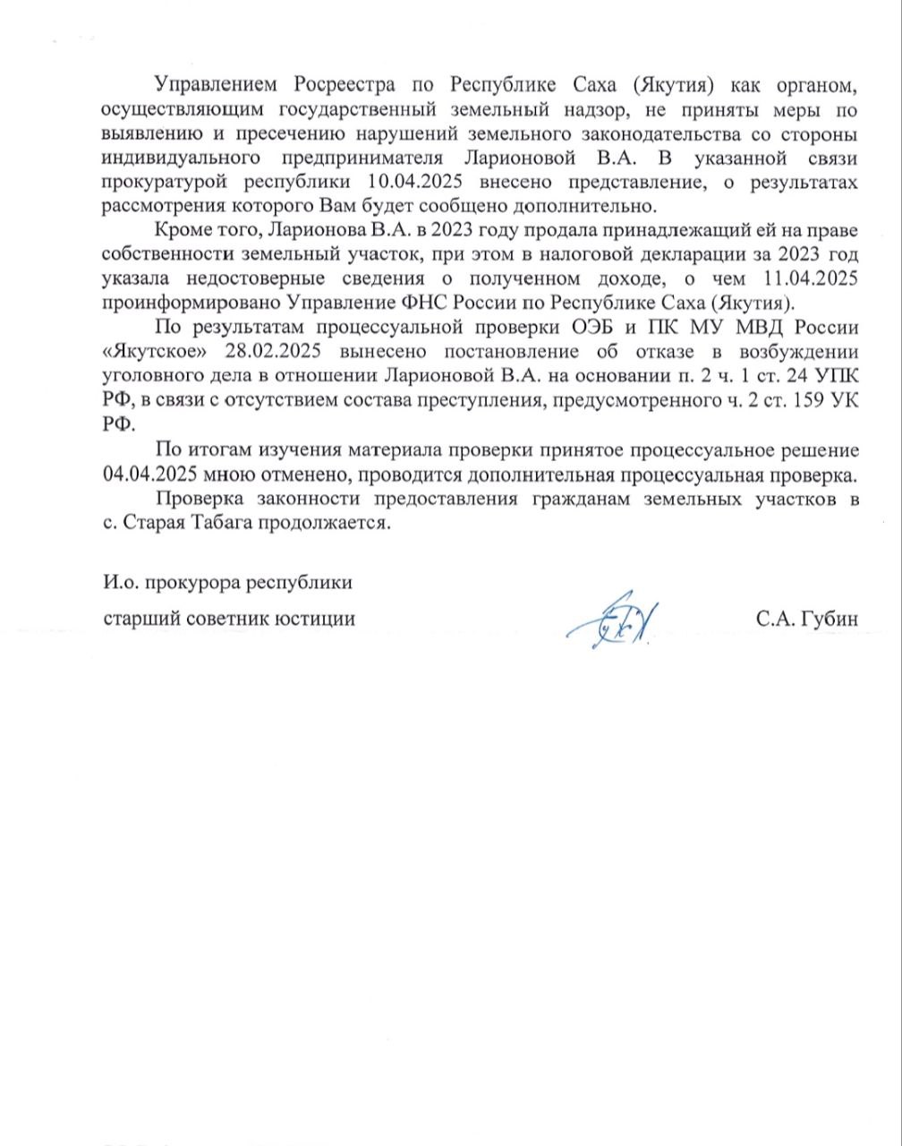 Согласно официальному письму прокуратуры, история начинается с сельскохозяйственных земель, которые были выделены главе фермерского хозяйства. Но «деятельность крестьянского хозяйства прекращена в 2014 г.», а его глава «фактически не работала, доход не получала».