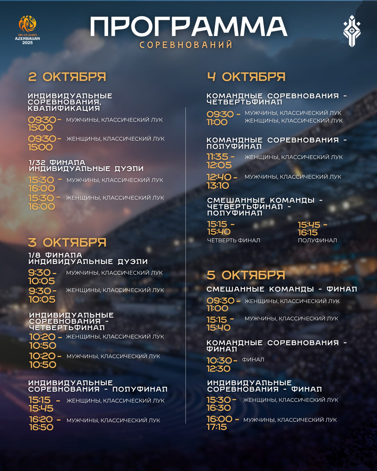 С 2 по 5 октября в городе Ханкенди (Азербайджан) проходят соревнования по стрельбе из лука в рамках III Игр стран СНГ 2025.