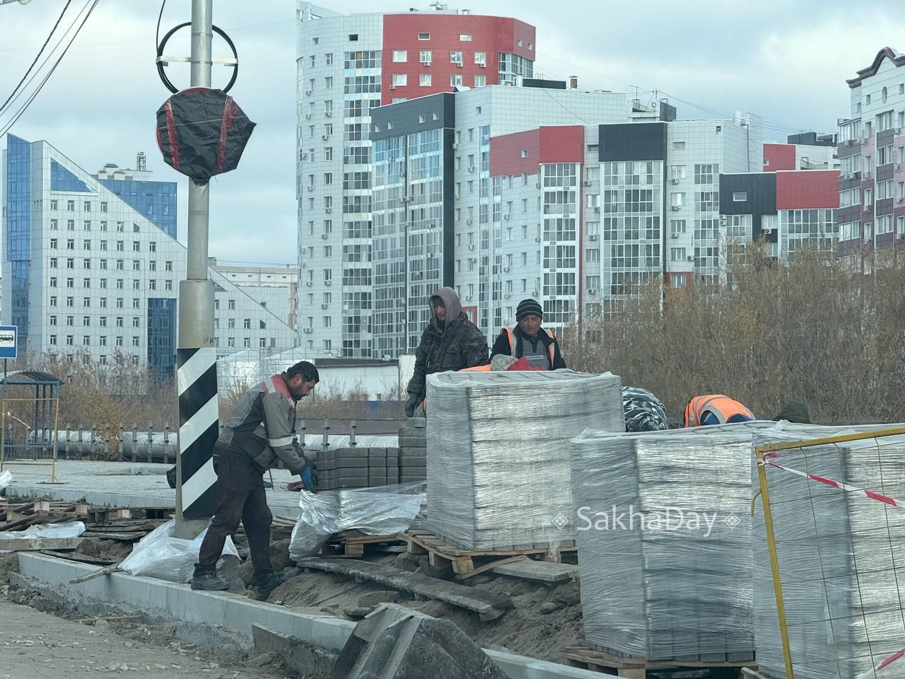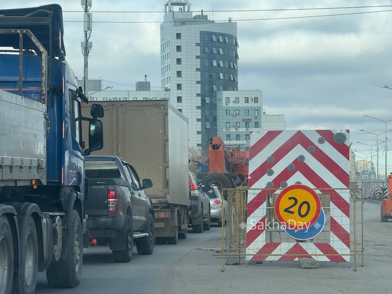 Пробка на Хабарова. Кладут плитку. @sakhaday