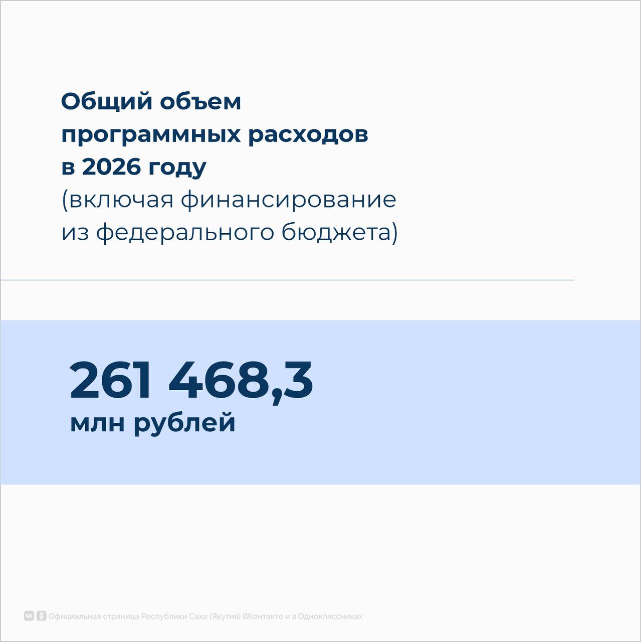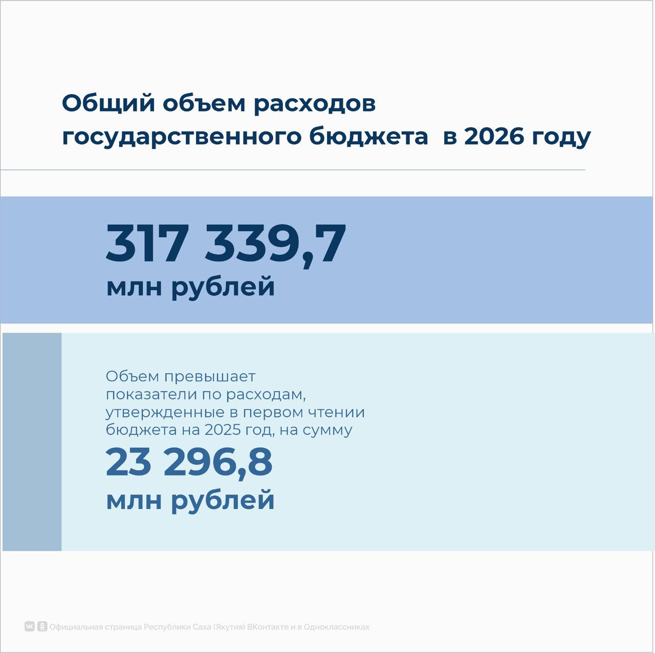 Общий объём доходов государственного бюджета в 2026 году составит 309 млрд 768,2 млн рублей, объём расходов государственного бюджета на 2026 год определён на уровне 317 млрд 339,7 млн рублей. Государственный бюджет Республики Саха (Якутия) представлен в виде комплекса 27 государственных программ, направленных на достижение 6 стратегических целей (блоков).