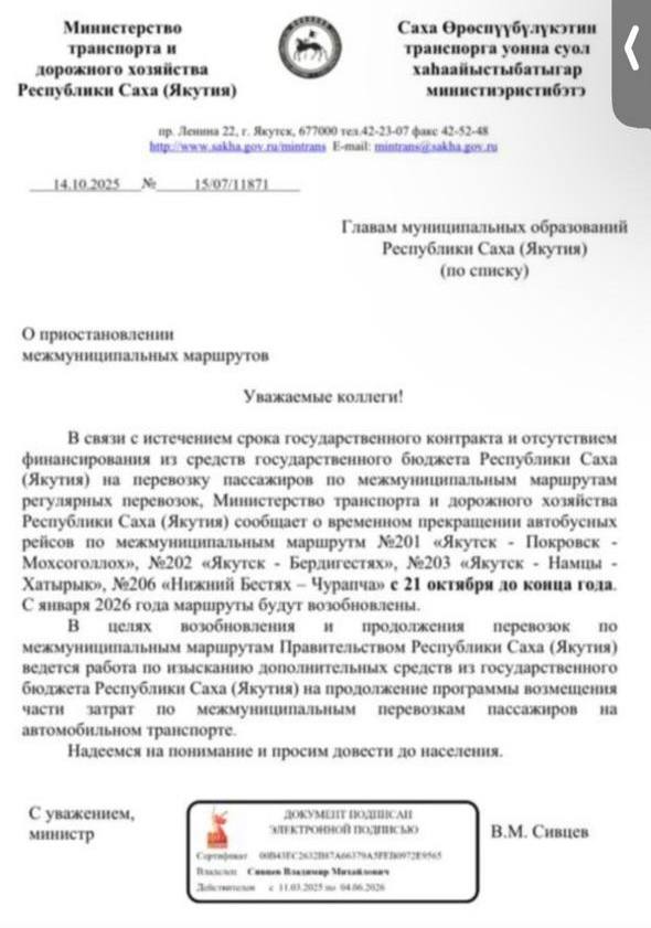 Вот такие сообщения напугали население нескольких улусов. Админ позвонил в ЯПАК, женщина сказала что до 21 октября автобус №201 будет курсировать, дальше посмотрим, денег из республиканского бюджета не выделят, тогда закроем маршруты, мы вам сообщим.
