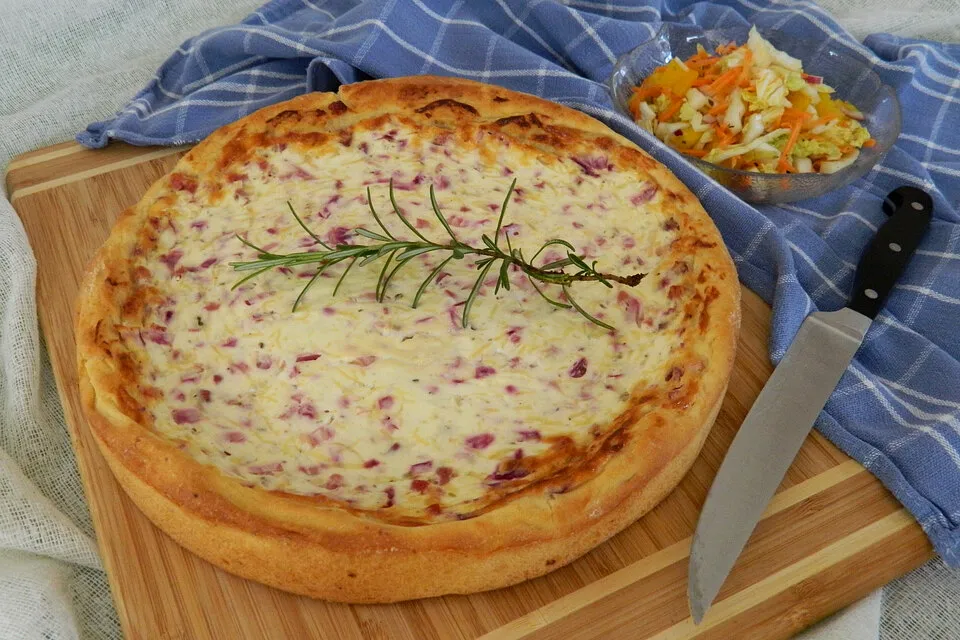 Теперь тесто готово — выложите его в форму, сформировав бортики, и аккуратно распределите начинку. Дайте пирогу немного подняться, после чего выпекайте при температуре 180 градусов до появления золотистой корочки. После приготовления, дайте пирогу отдохнуть, и для аромата положите на него веточку свежего розмарина.
