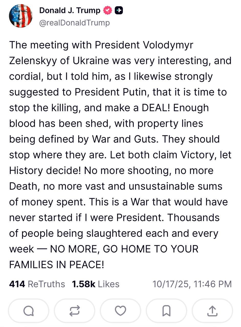 «Встреча с Владимиром Зеленским была очень интересной и душевной, но я сказал ему, как и президенту (Владимиру) Путину, что пора прекратить убийства и заключить сделку!Достаточно пролитой крови, достаточно определять границы с помощью войны и храбрости. Пусть остановятся там, где находятся. Пусть оба объявят себя победителями — история сама рассудит! Больше никаких выстрелов, никаких смертей, никаких огромных и непосильных трат. Эта война никогда бы не началась, если бы я был президентом. Тысячи людей убивают каждую неделю — хватит, возвращайтесь домой к своим семьям с миром!».