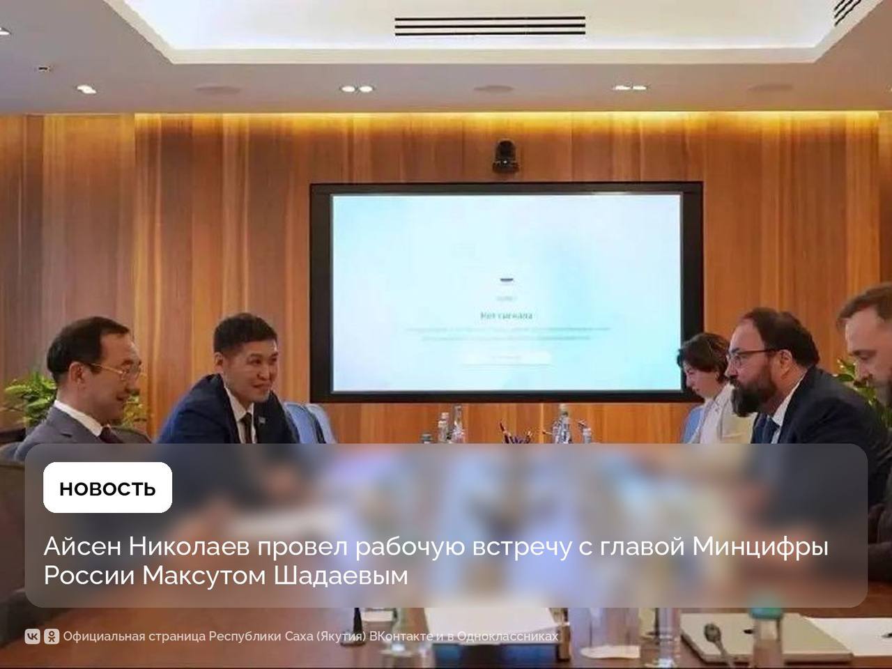 В рамках рабочей командировки в Москву глава Республики Саха (Якутия) Айсен Николаев встретился с министром цифрового развития, связи и массовых коммуникаций Российской Федерации Максутом Шадаевым.