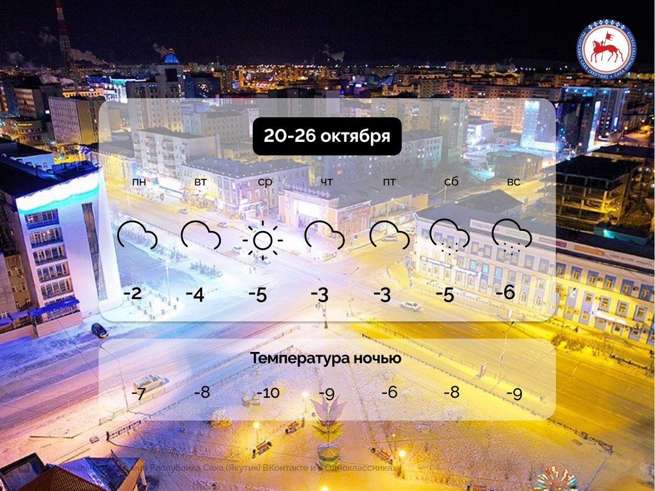 Согласно прогнозу Росгидромет, в период с 20 по 26 октября в столице республики, Якутске, преимущественно ожидается облачность.