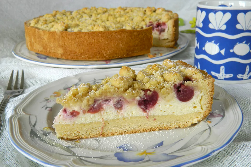 Далее взбейте творог с яйцами, сахаром и щепоткой ванили до однородной массы. Теперь можно начинать сборку десерта: возьмите две трети крошки и равномерно распределите по форме. Затем аккуратно вылейте творожную начинку и добавьте вишни. Завершите посыпкой оставшейся крошки, чтобы получилась вкусная корочка. Выпекайте до золотистого цвета.