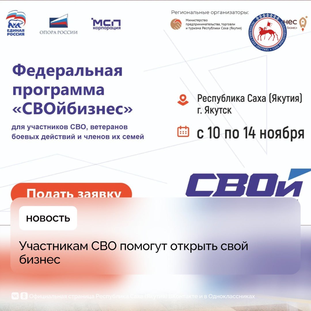 Заявки на участие принимаются с 2 по 29 октября на сайте мсп.рф/services/SVOy_business/. Обучение пройдёт с 10 по 14 ноября в Якутске.