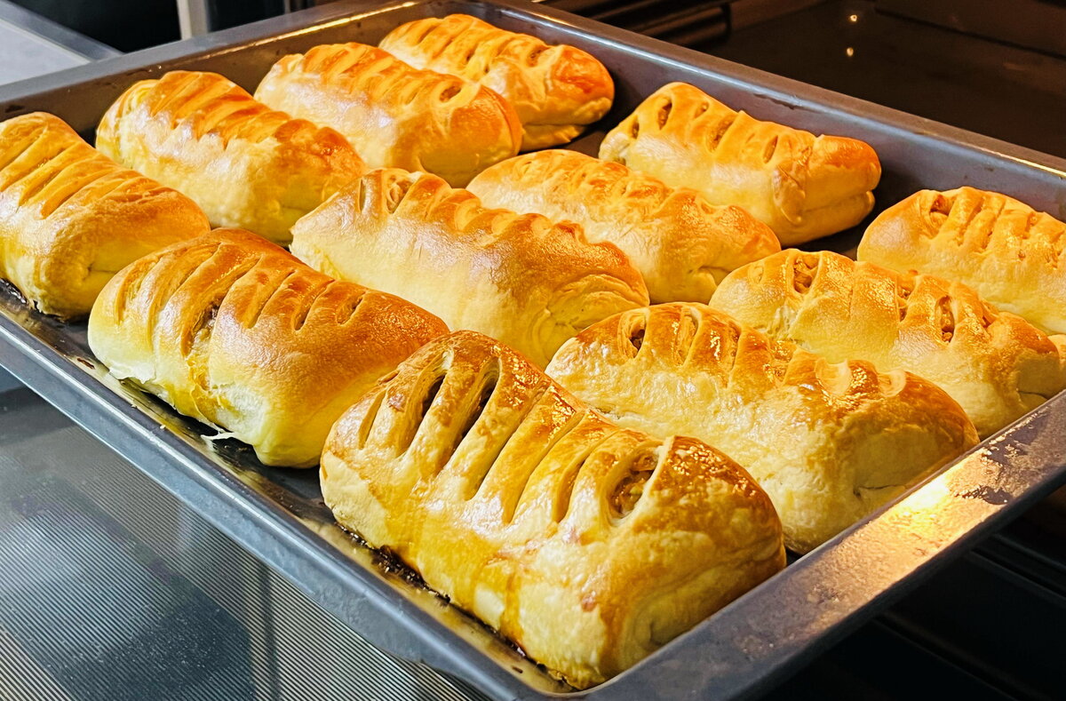 После того как начинка готова, тесто должно быть раскатано, смазано сливочным маслом, завернуто и разрезано. Получившиеся заготовки наполняются начинкой и запекаются в духовке при температуре 180 градусов в течение 35-40 минут. Не забудьте смазать пирожки желтком и сделать небольшие надрезы, чтобы в процессе выпекания они не деформировались.