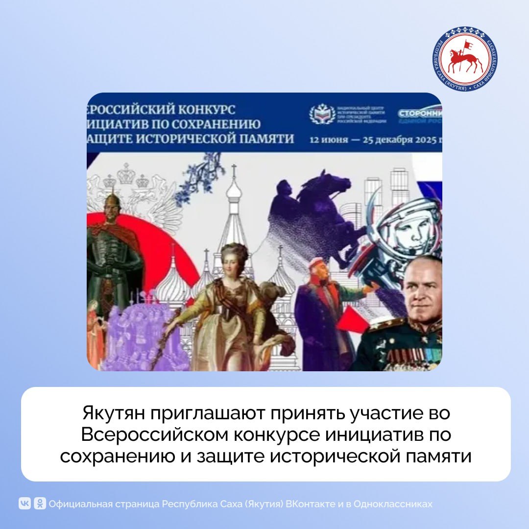 Национальный центр исторической памяти при Президенте Российской Федерации и Центральный совет сторонников Всероссийской политической партии «ЕДИНАЯ РОССИЯ» приглашают якутян принять участие во Всероссийском конкурсе инициатив по сохранению и защите исторической памяти.