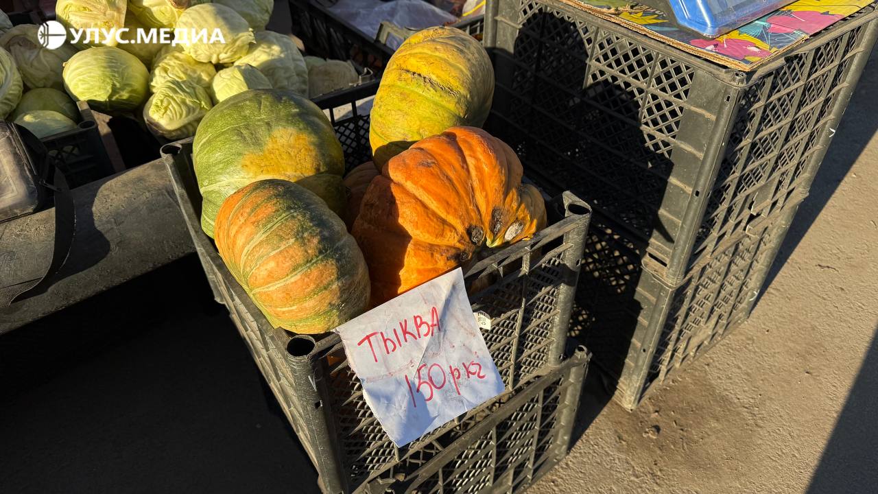 На рынке — большой выбор овощей местного урожая. Капуста стоит 60-70 рублей за килограмм, морковь — 60-75 рублей, свекла — 75-85 рублей, тыква — 150 рублей, болгарский перец — 350 рублей.