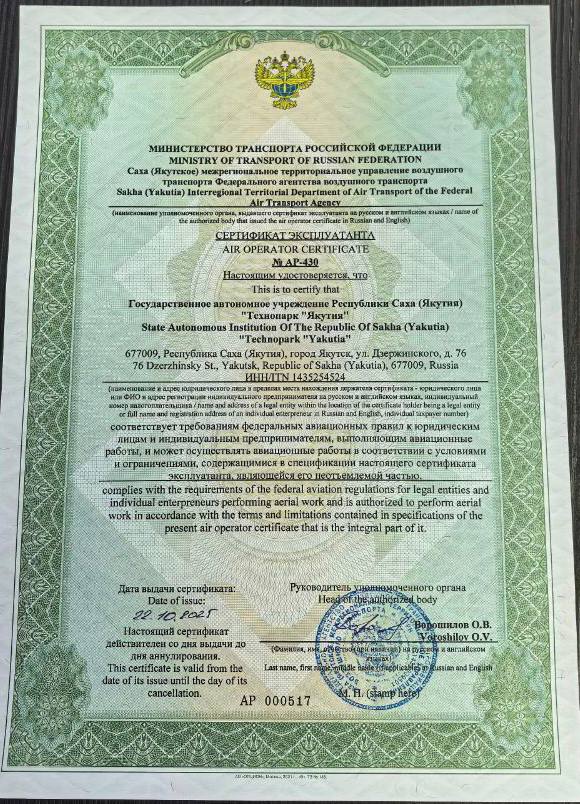 Технопарк «Якутия» стал официальным эксплуатантом беспилотных воздушных судов!