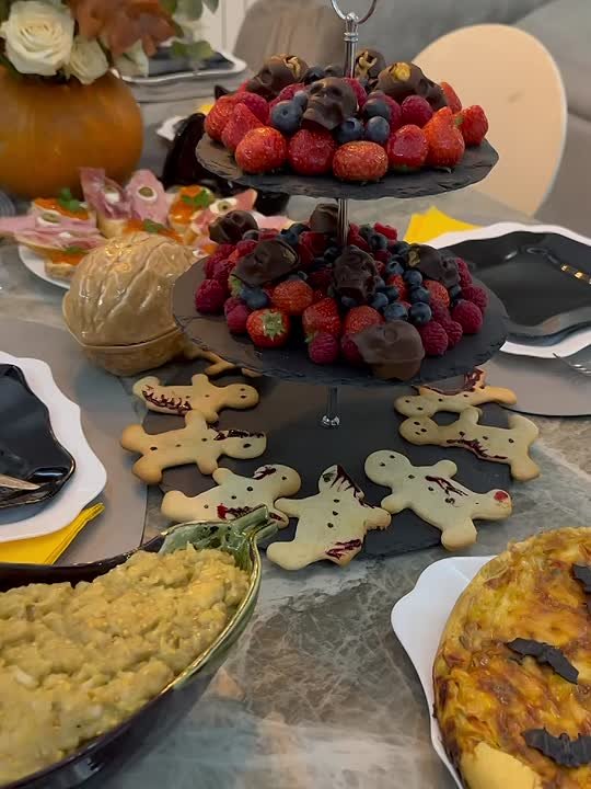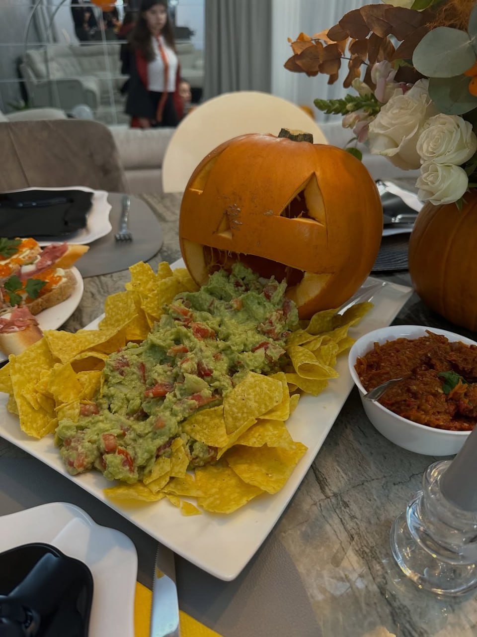 Полина Миклиук показала семейный стол к Хэллоуину. Как вам тыква, которую стошнило гуакамоле? @sakhaday