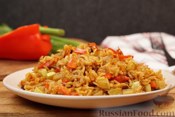 - Рис с овощами – сытное и ароматное блюдо. Обжаренный рис с кабачками, морковью и болгарским перцем создаст сочную композицию, которая не только порадует глаз, но и насытит организм необходимыми витаминами.