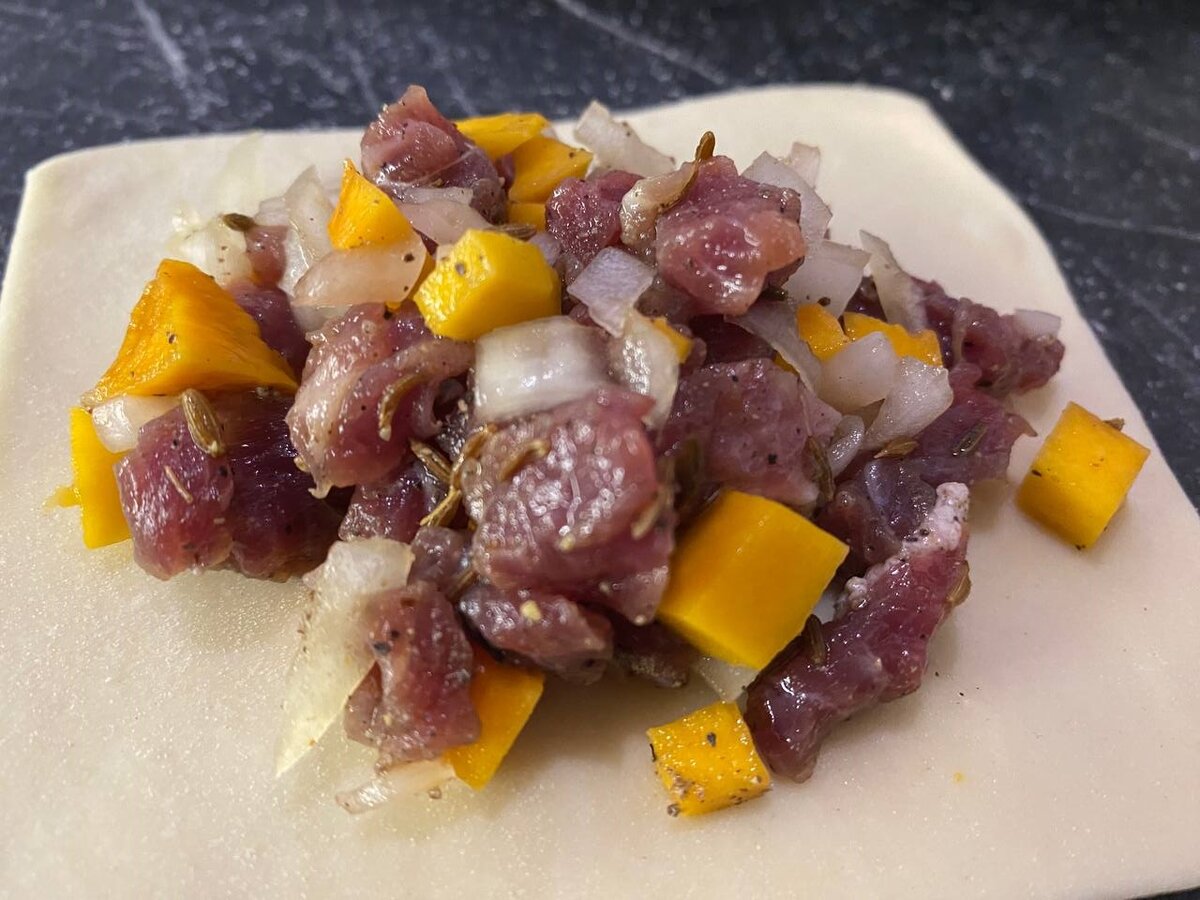 Тесто для мантов – основа основ, и для получения отличного результата нужно уделить достаточно времени его замесу. Рекомендуется оставить тесто на некоторое время, чтобы оно «отдохнуло». Пока тесто набирает нужную консистенцию, можно заняться нарезкой начинки. Мясо, лук и тыкву нарезают небольшими кубиками, размером около 0,3–0,5 сантиметров.