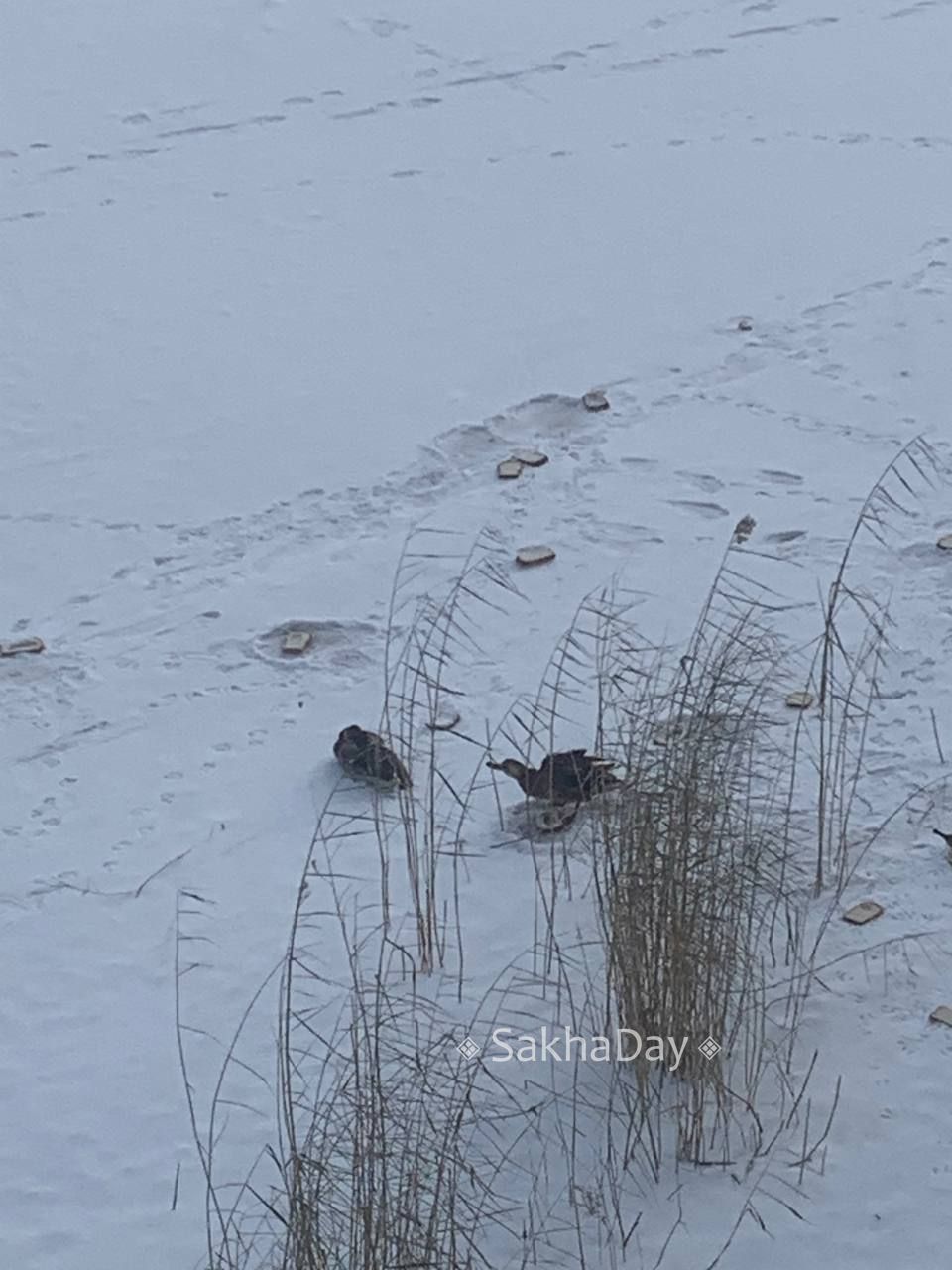 Уточки еще не улетели, сидят на хлебе