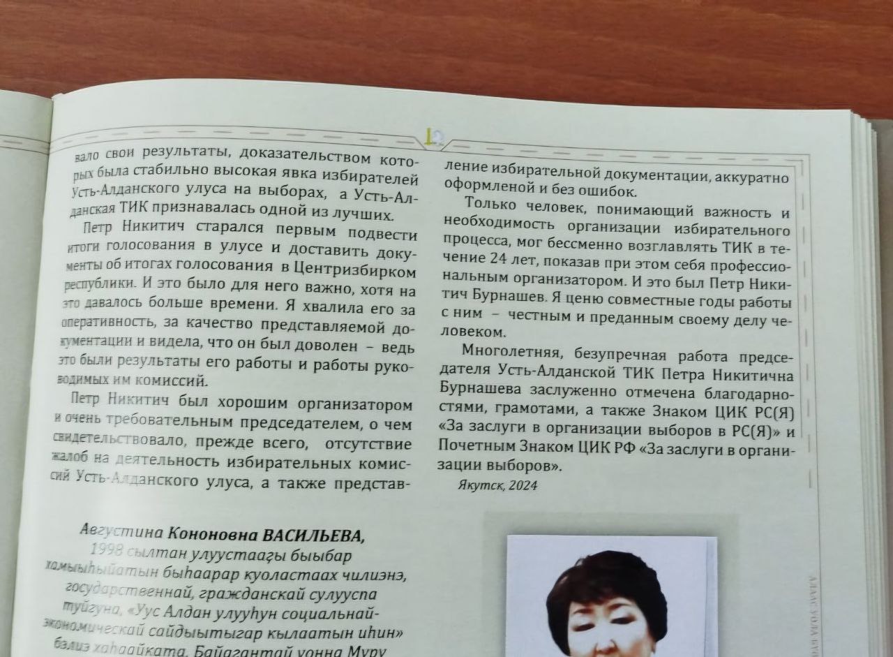 Книга посвящена Петру Никитичу Бурнашеву (1994-2022), работавшему председателем Усть-Алданской территориальной избирательной комиссии 24 года. Общий стаж его работы в избирательных комиссиях на общественных началах 46 лет. Начинал он председателем Усун-Кюельской УИК в далеком 1969 г.