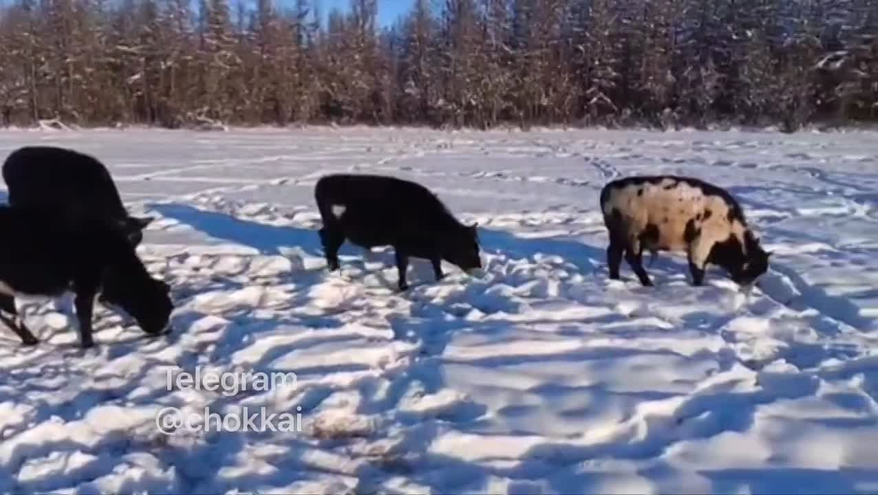Коровы якутской породы сами добывают себе корм, активно работая копытами. На дворе 30 октября, уточняет фермер. На кадрах Эвено-Бытантайский улус.
