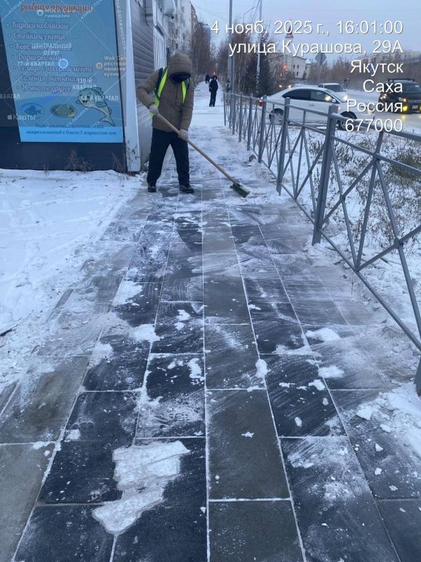 Работа подрядчика Управы Центрального округа по уборке тротуаров.
