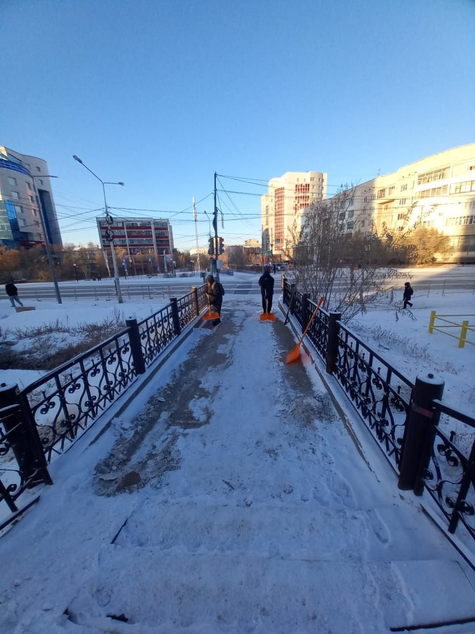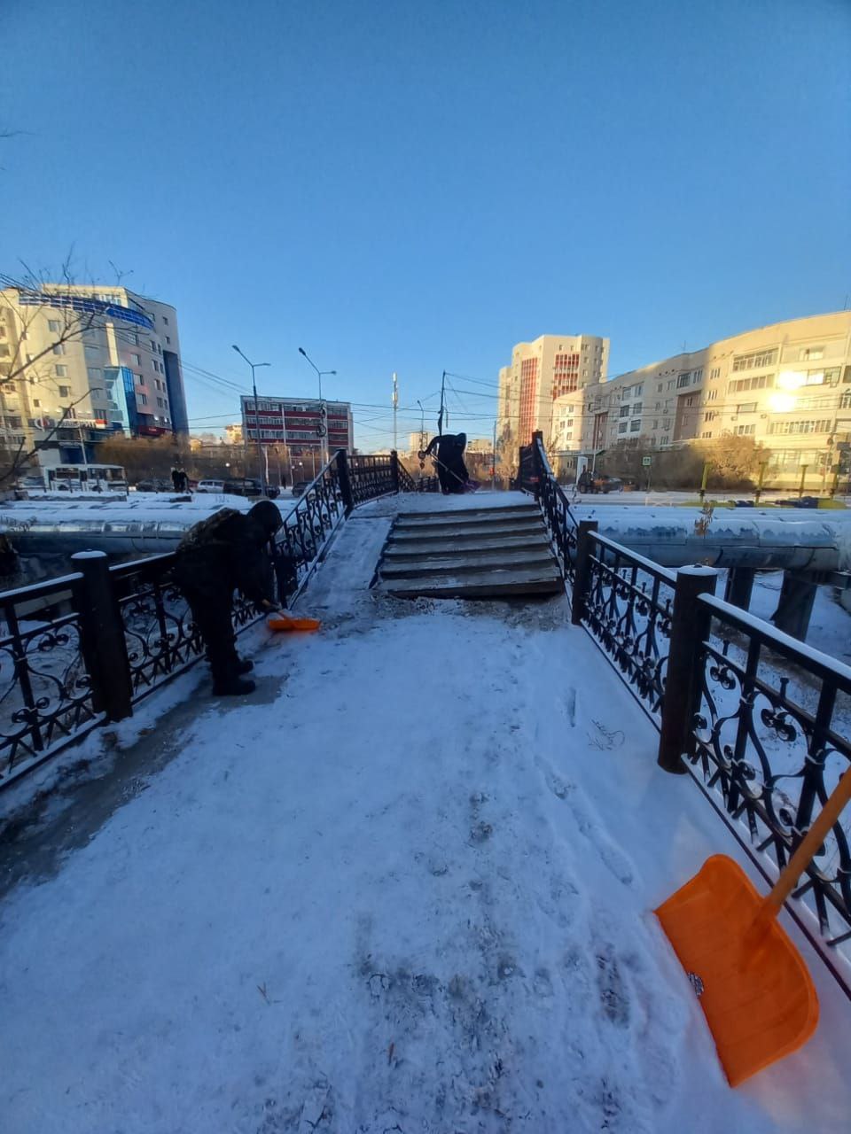 Дворники тщательно чистят снег на мосту — безопасность и чистота на первом месте!