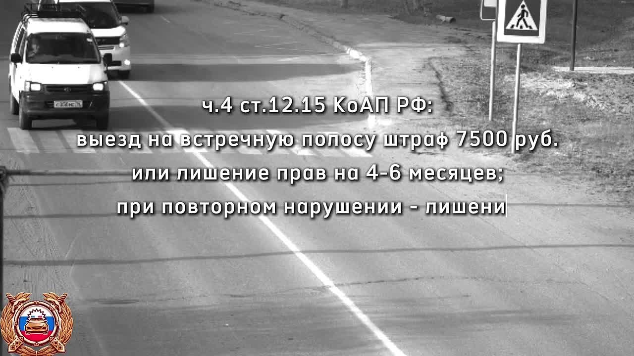 Напоминаем, что согласно ч.4 ст.12.15 КоАП РФ, выезд в нарушение ПДД на полосу, предназначенную для встречного движения, влечет наложение административного штрафа в размере 7500 рублей или лишение права управления транспортным средством на срок от 4 до 6 месяцев. Повторное совершение данного правонарушения влечет лишение права управления на 1 год.