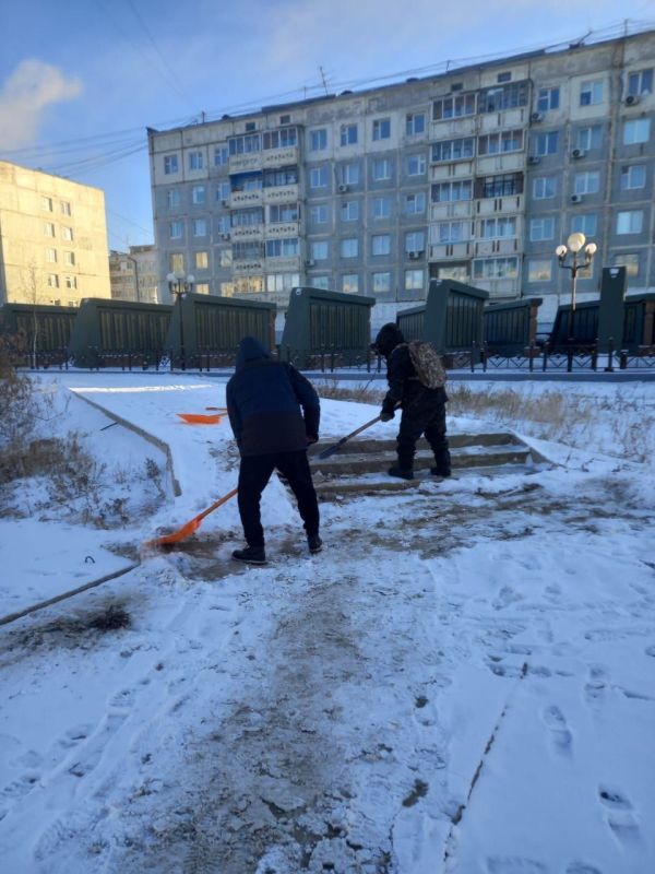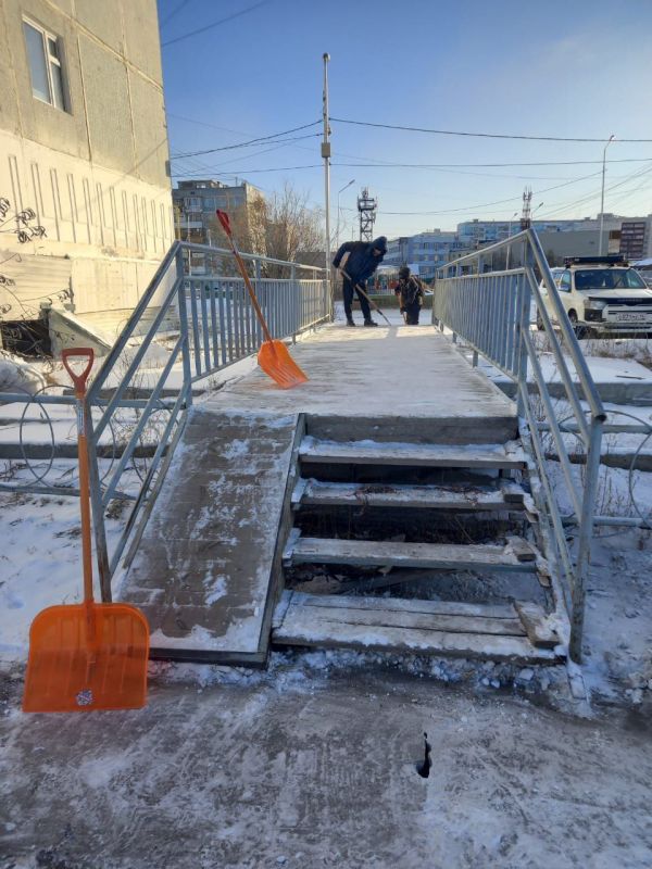 Силами муниципальных дворников продолжается работа по очистке мостиков и лестниц для перехода.